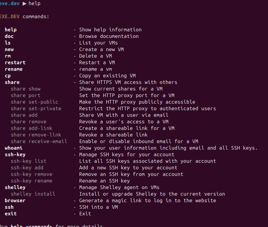 ssh exe.dev -i .ssh/my_exe_dev_key.pubThen I’ll get a shell where I can manipulate all the VMs: